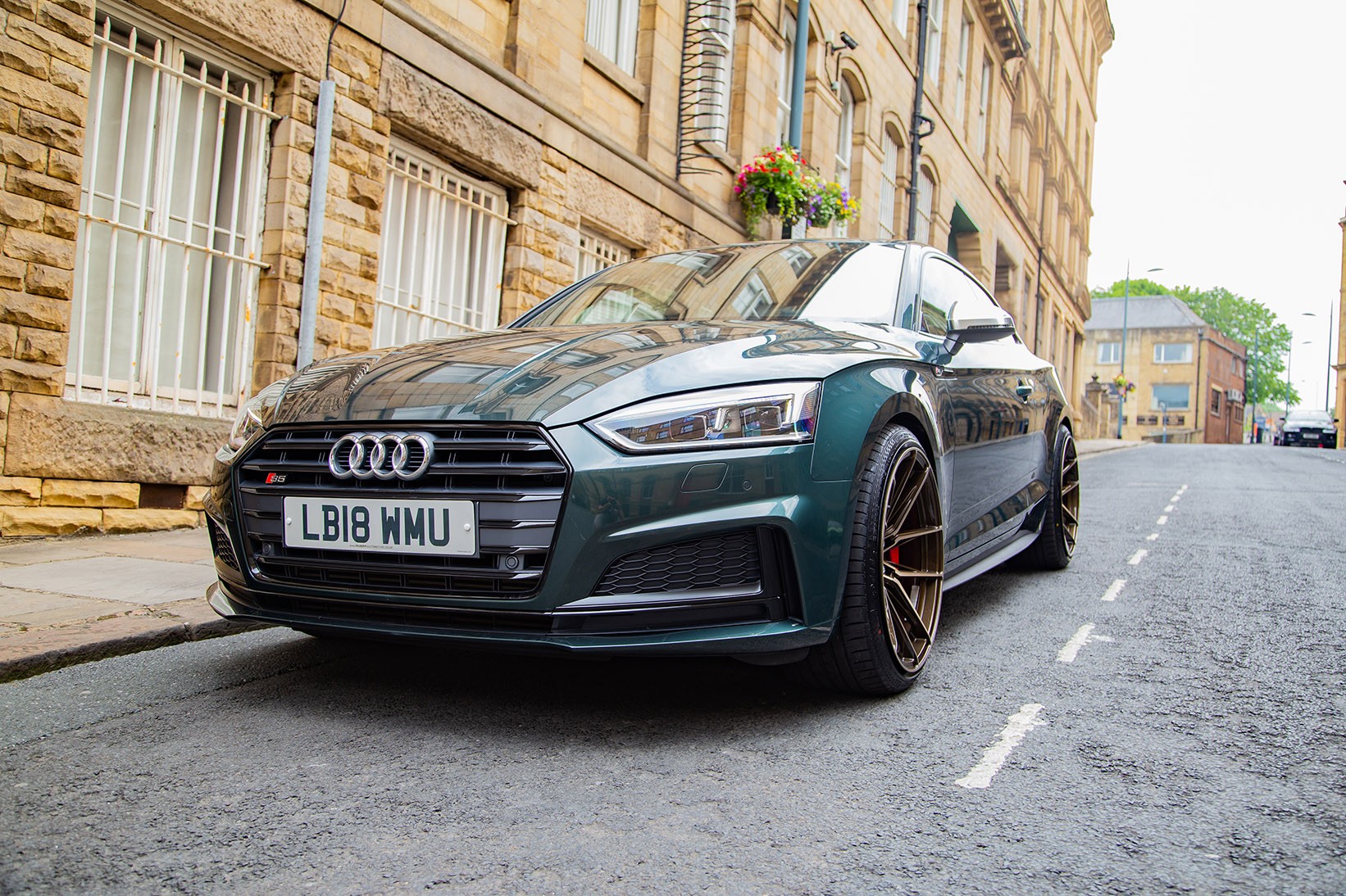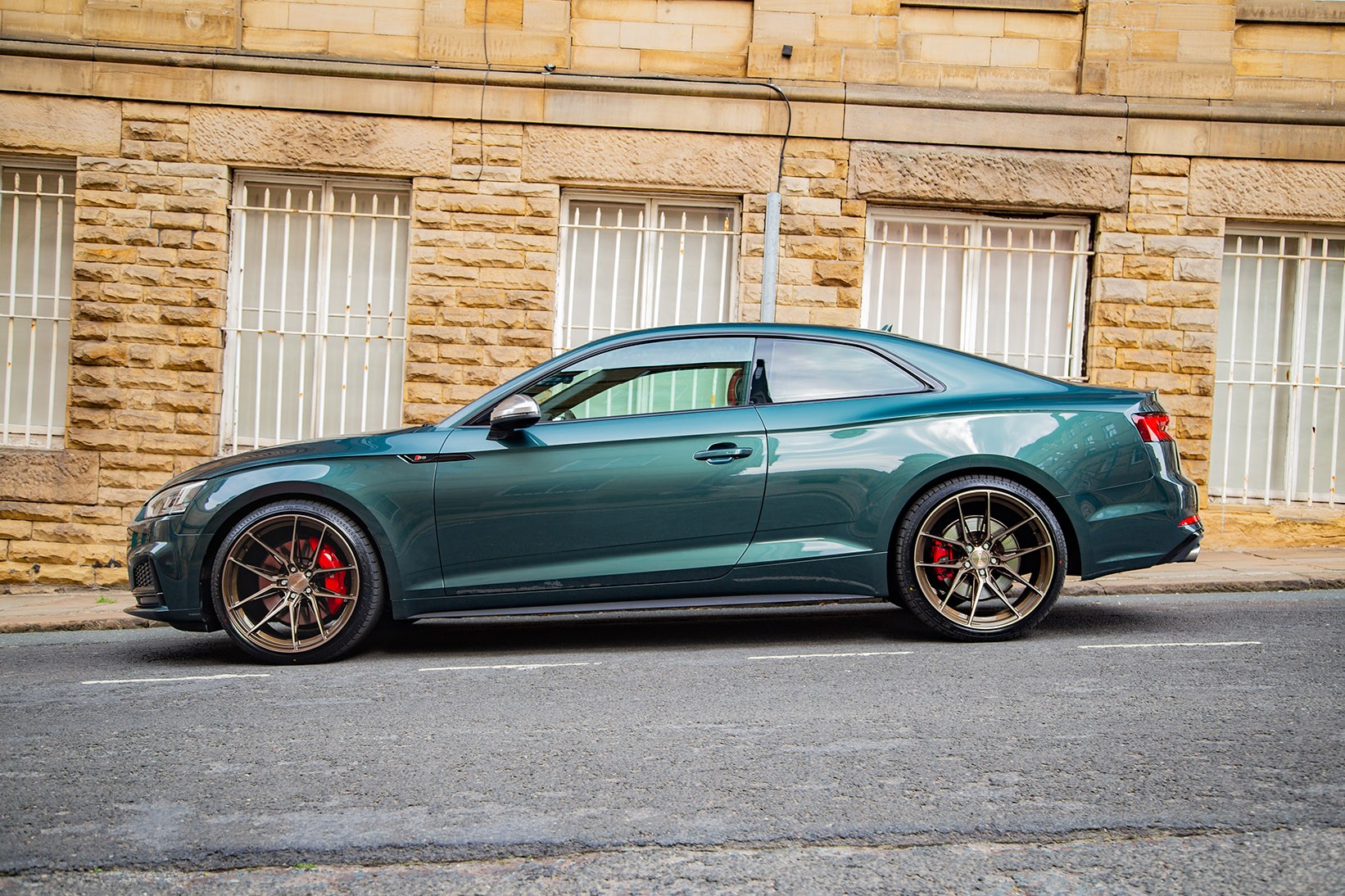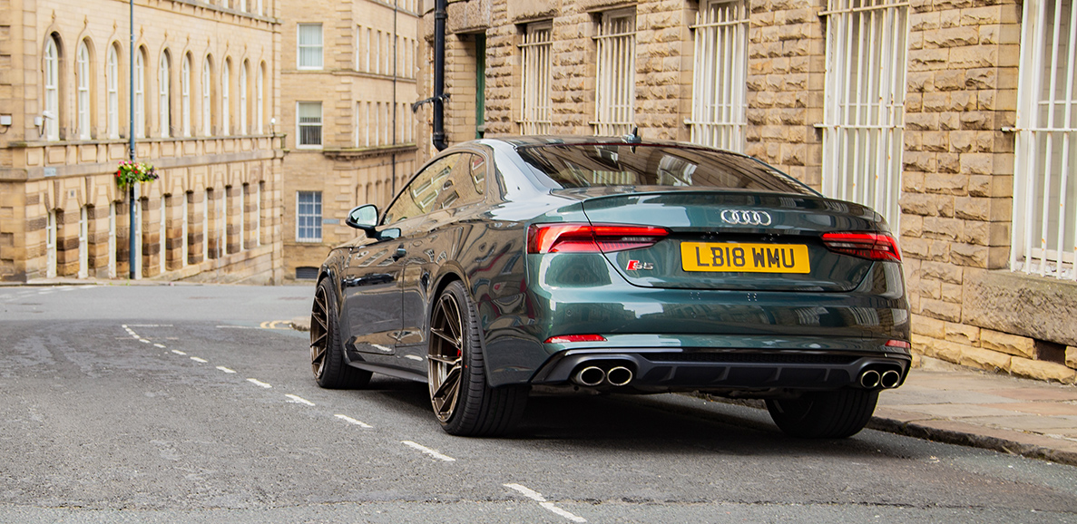 The Audi S5 equipped with a set of our RF107 wheels finished in Bronze Double Dark Tint complement the Gotland Green Metallic paintwork nicely. We took to the streets of Little Germany in Bradford to show off the aggressive fitment of our RF107. With 20×11 all round, the concave is unreal!