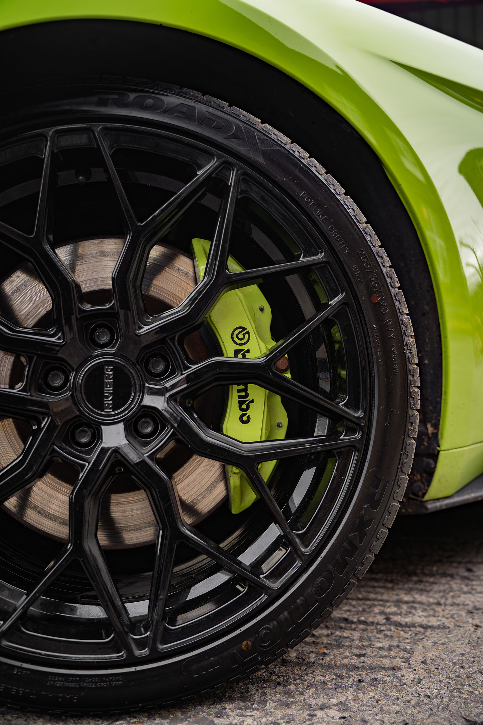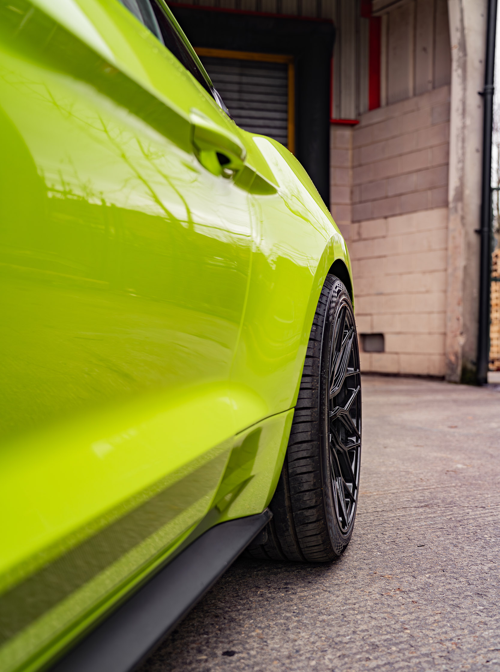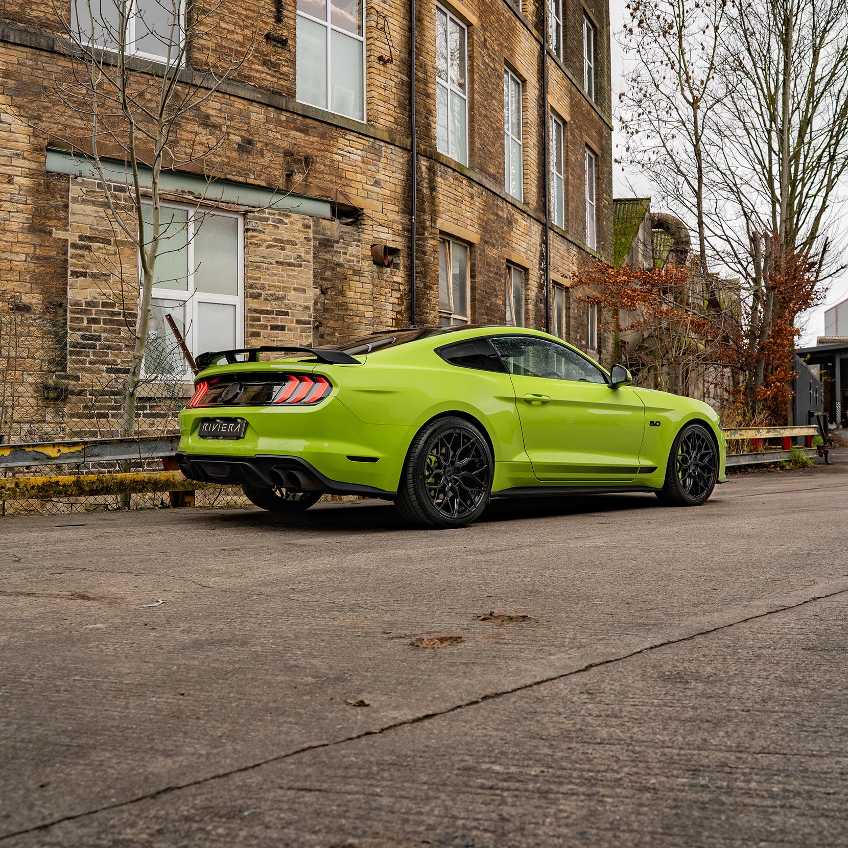 For this build, we selected our Riviera RF108 wheels. The RF108 is a sophisticated multi-spoke mesh design that takes direct inspiration from classic motorsport. Finished in a deep, high-shine Gloss Black, these wheels provide a stunning contrast against the car’s bodywork, highlighting the Mustang’s performance brakes and muscular silhouette. But the RF108 is more than just a pretty face, it’s manufactured using Flow Forming technology. This process makes the wheel stronger and lighter than traditional cast alternatives, reducing unsprung weight for better handling and sharper throttle response, essential for any 5.0L V8. Fitment is everything.