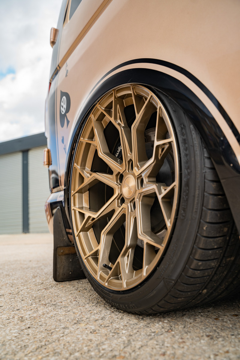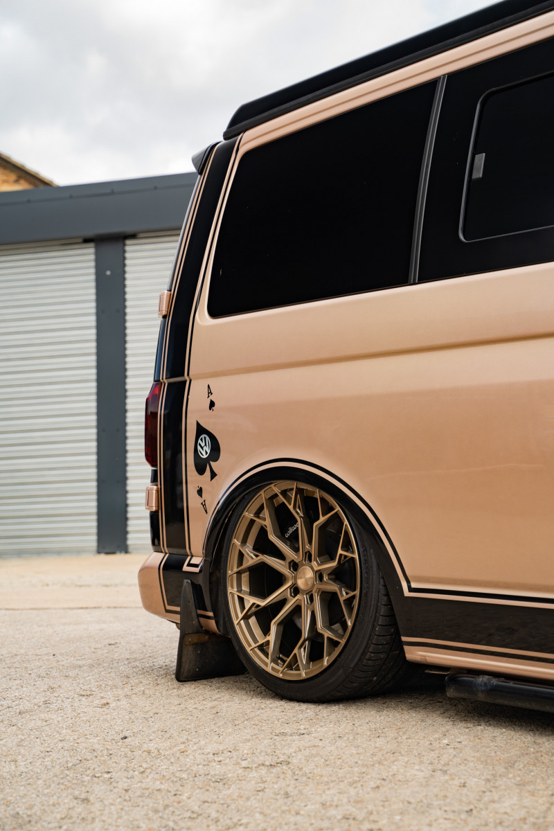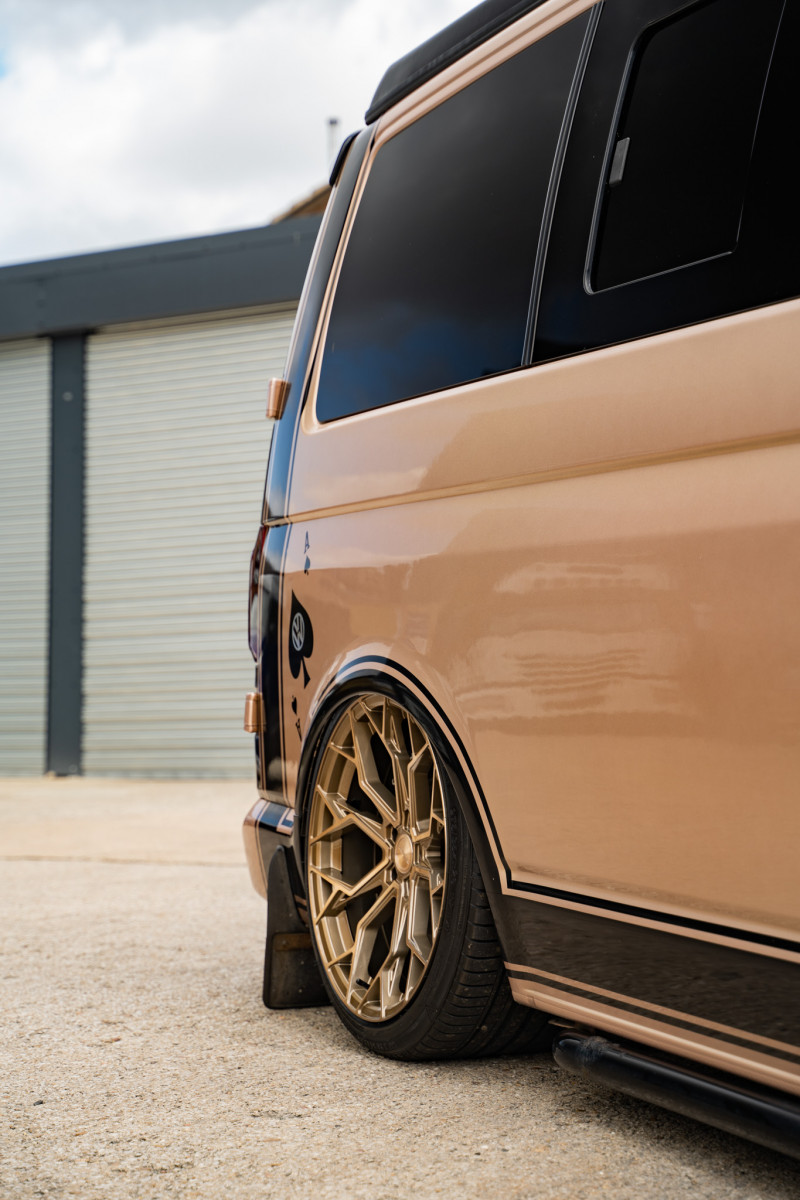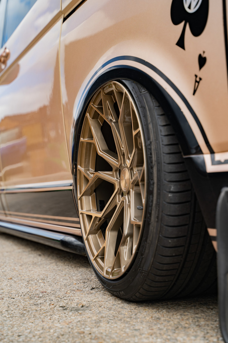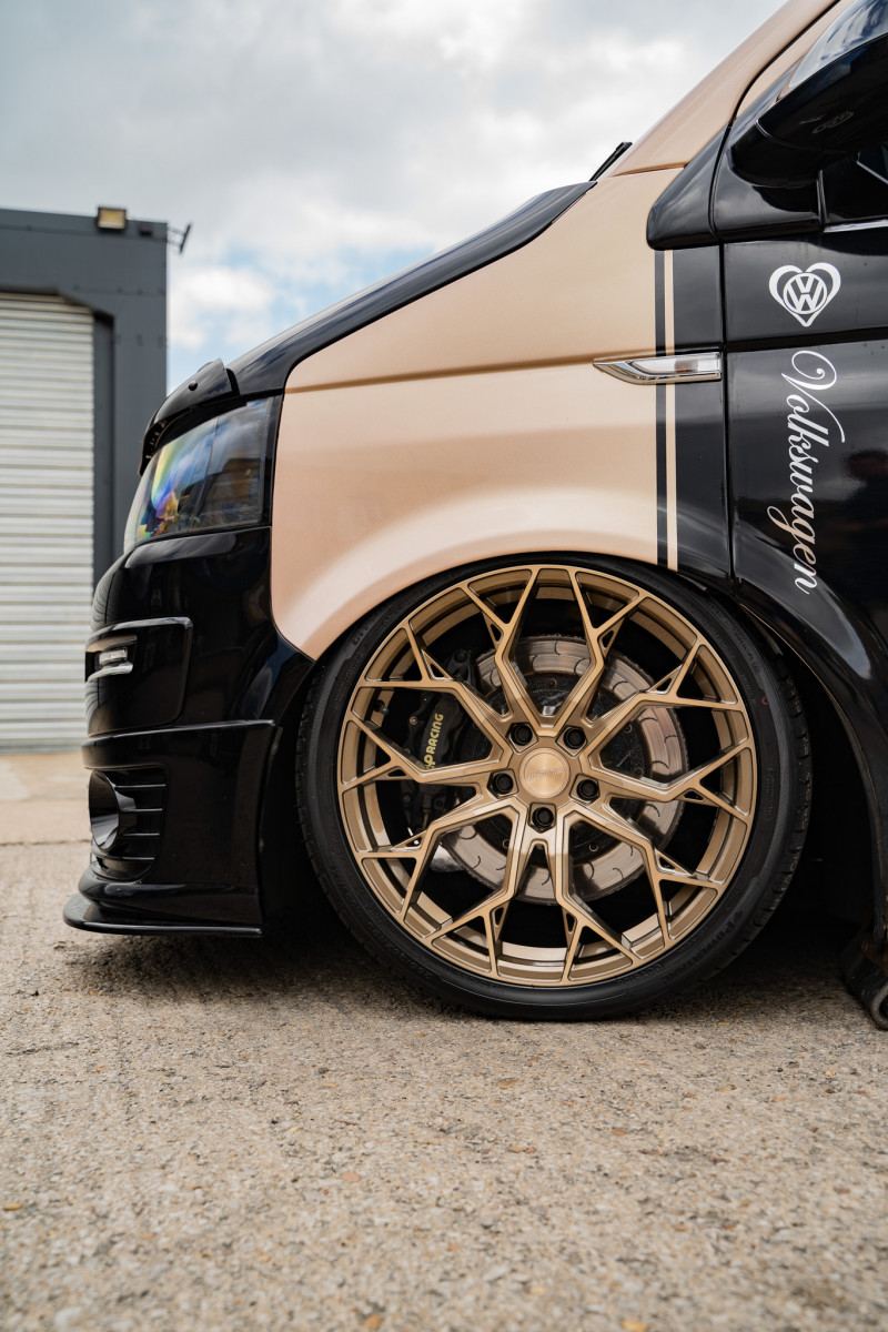 This bagged Volkswagen Transporter is equipped with a set of our BRAND NEW Riviera RF5 Flow Formed wheels in 20″. Opting for our Bronze Double Dark Tint finish, this customer went for a risky colour clash which worked out perfectly, the Bronze wheels go so well against the Bronze paintwork. The staggered fitment gives the Volkswagen Transporter an aggressive stance with a nice deep concave on the rear, combine that with air suspension and the fitment leaves you speechless, take a look at the results!